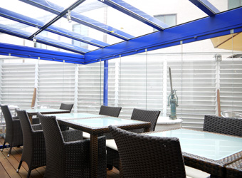 グラスハウス®は240色以上カラーチョイスが可能です。また側面のガラスパネルも可動式ですので全開放も可能です。写真のように全て閉じた状態でも国産のガーデンルームのようなアルミの枠が存在しませんので透明感のあるスッキリとした印象があります。また屋根もガラス製ですので屋根の上に人が乗ってのお掃除も可能です。グラスハウス®内部には3テーブルで10席が設けられています。
