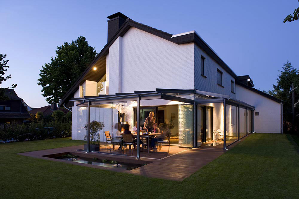 建物の軒下にガラスパネルをはめ込んでいる点が最大の特徴で、建物のデザインを損なうことなく、ガラスに囲まれた室内空間を実現できました。