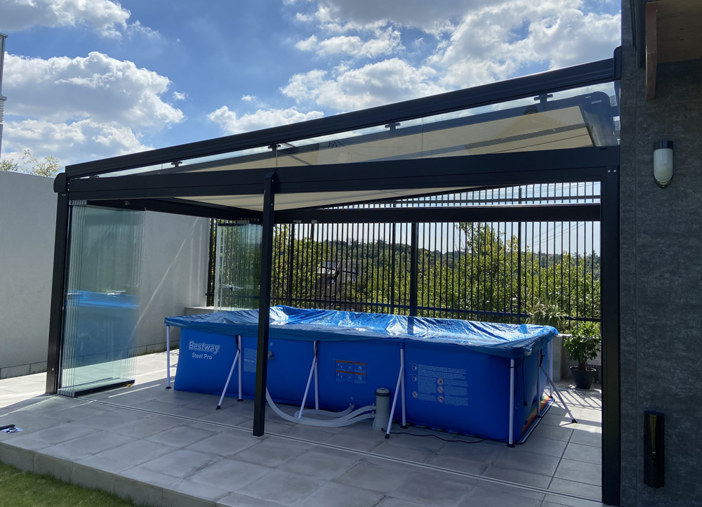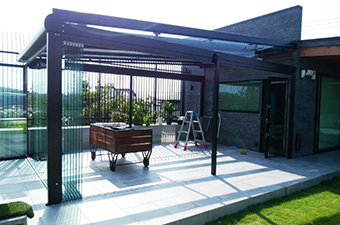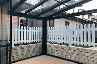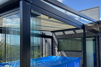 SL22最大の特徴は側面ガラスパネルが特殊形状に対応しており、傾斜している屋根の勾配に合わせてガラスパネルをオーダーできる点です。そして、特殊形状でもガラスパネルをスライドできるのが、他社製品にはない最大の特徴です。