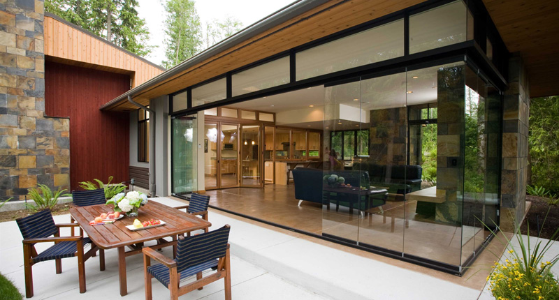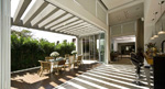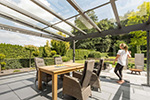 「プロラインS(旧SL25)」にはフレーム枠がなく、パネル越しでもクリアで大きな視界が広がり、既存の木の柱もくっきりと映えます。ガラスパネル解放時にはパネルを直角にターンさせてパネルを端部に収納でき、大きな開口で抜群の解放感も従来のままです。