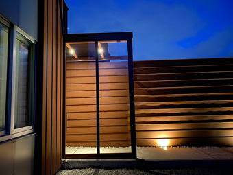 お庭に面した「オーラ」は日常の中にゆっくりと寛げる空間と時間を生み出してくれ、日々の生活をより豊かにしてくれます。木目のウッドデッキやプラスGの目隠しが「オーラ」にとてもマッチしています。