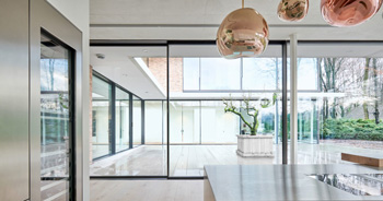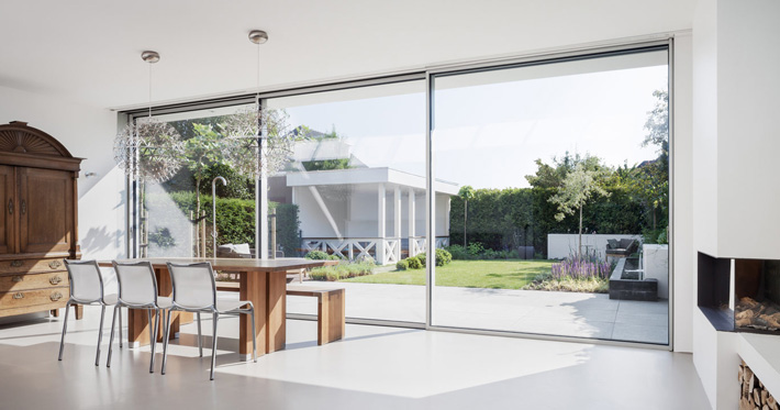 最大で15m2もの広いガラスパネルに対し、フレーム幅はわずか34mm。ドア全体の98%がガラス面で占められており、圧倒的な視界性が確保されています。まるで屋外にいるような解放感と透明性が実現できます。