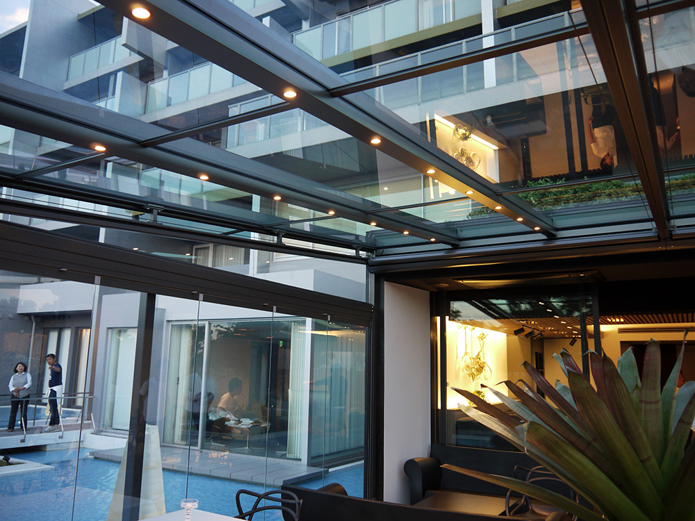 グラスハウス®内でより快適にお過ごし頂く為に、オプションにて電動可動式の日除けをご用意しております。